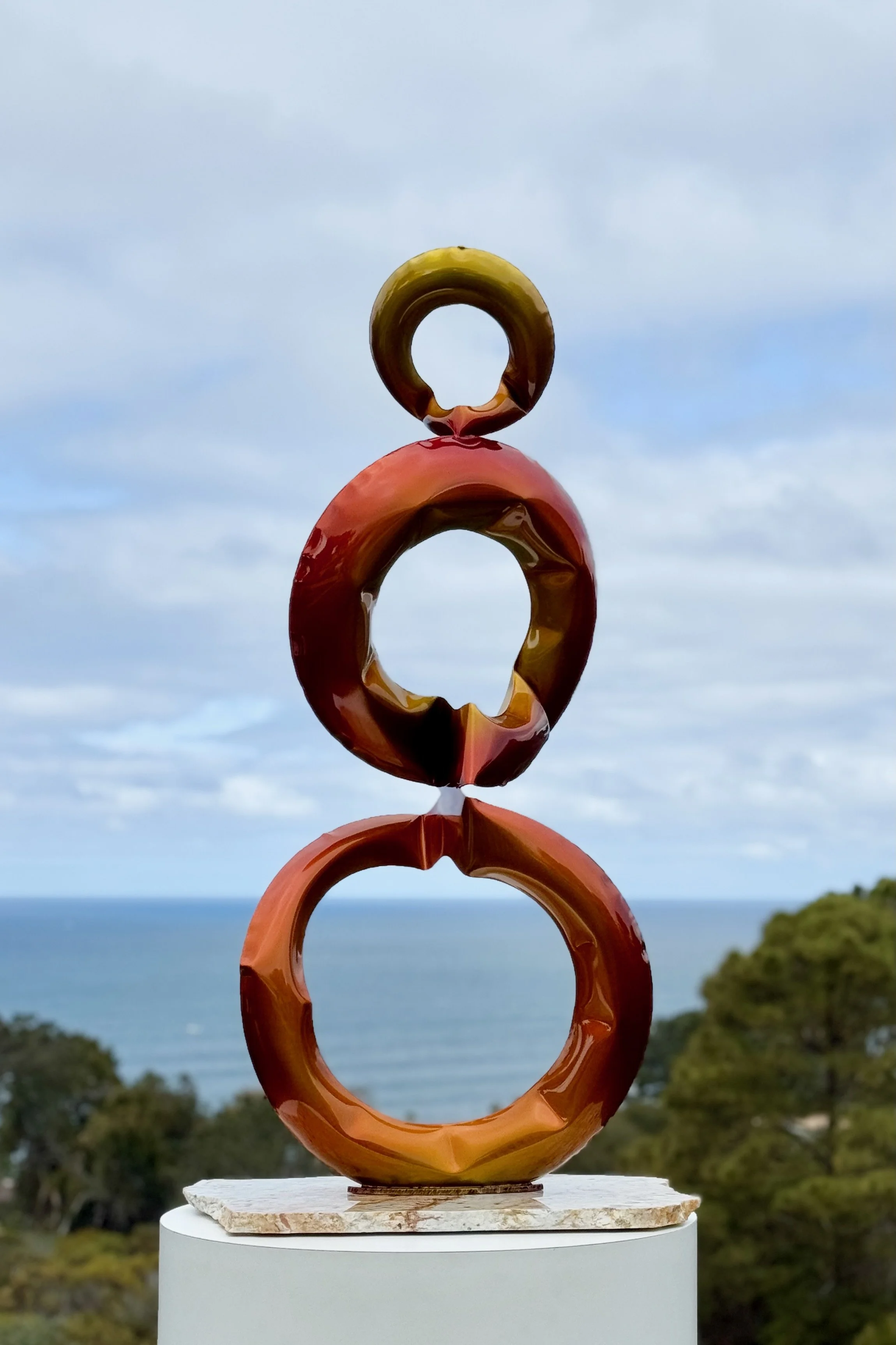 In his studio, Jon Koehler transforms stainless steel into fluid, balloon-like forms that seem to defy gravity. Each sculpture emerges from force and intuition, capturing movement, light, and the energy of nature in a solid, weightless presence.